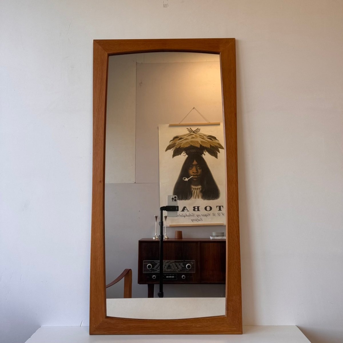 Mooie mid century vintage spiegel uit de jaren ‘60. Afkomstig uit Denemarken. Een brede lijst van eikenhout.Afmetingen: 50x100x1cm