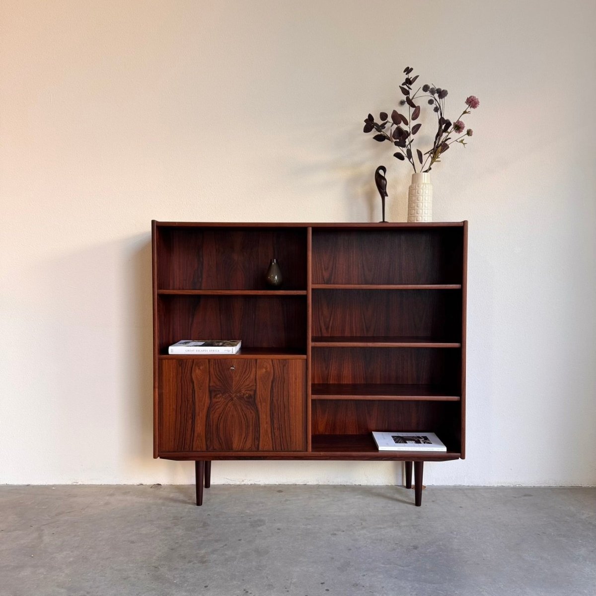 Deense mid-century boekenkast uitgevoerd in palissander. De boekenkast heeft 4 in hoogte verstelbare planken.