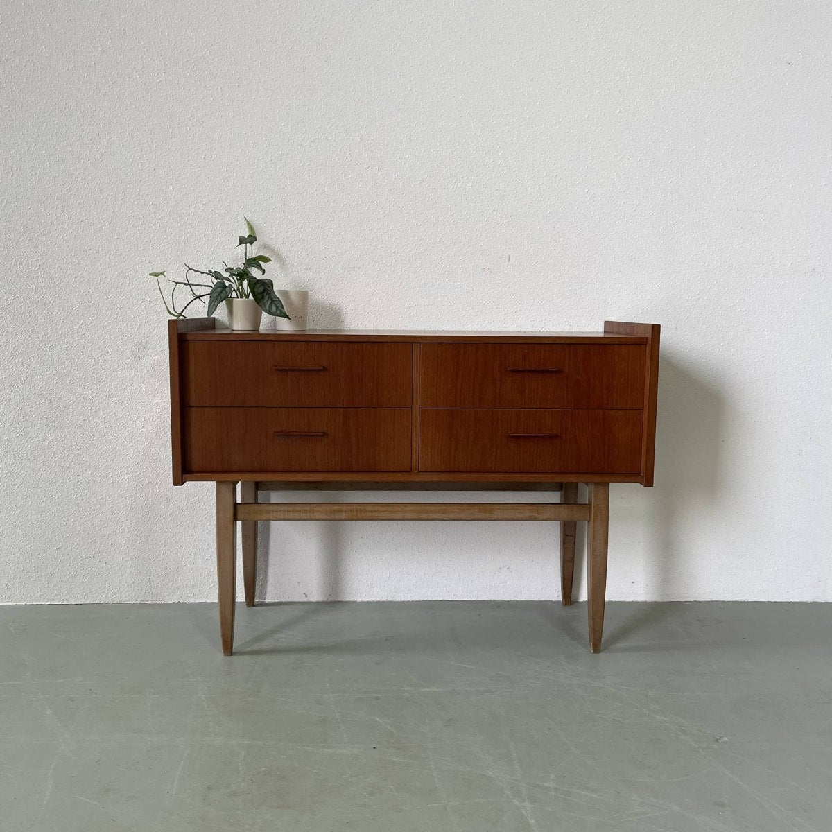 LAND: Denemarken JAAR: circa 1960ONTWERPER: onbekendVERVAARDIGD IN: teakCONDITIE: prachtige staatAFMETINGEN: 85x32x62NO: 1488VERDERE INFO:4 lades van elk 37.5x25x10cmHet onderstel is vervaardigd in beuken.