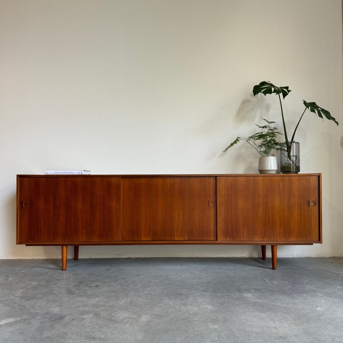 Deens vintage lowboard XL uitgevoerd in teak. Het lowboard heeft 3 schuifdeuren en 4 lades achter de rechter schuifdeur. Het lowboard is in goede staat. Alleen op het bovenblad zijn wat verkleuringen zichtbaar.