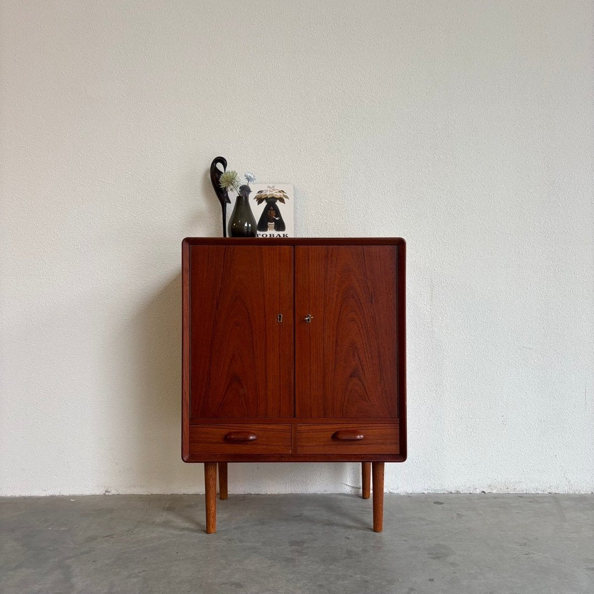 Klein vintage sideboard - drankenkastje uit de jaren '60. Een Deens design en vervaardigd in teak. Mooi detail zijn de hoeken.