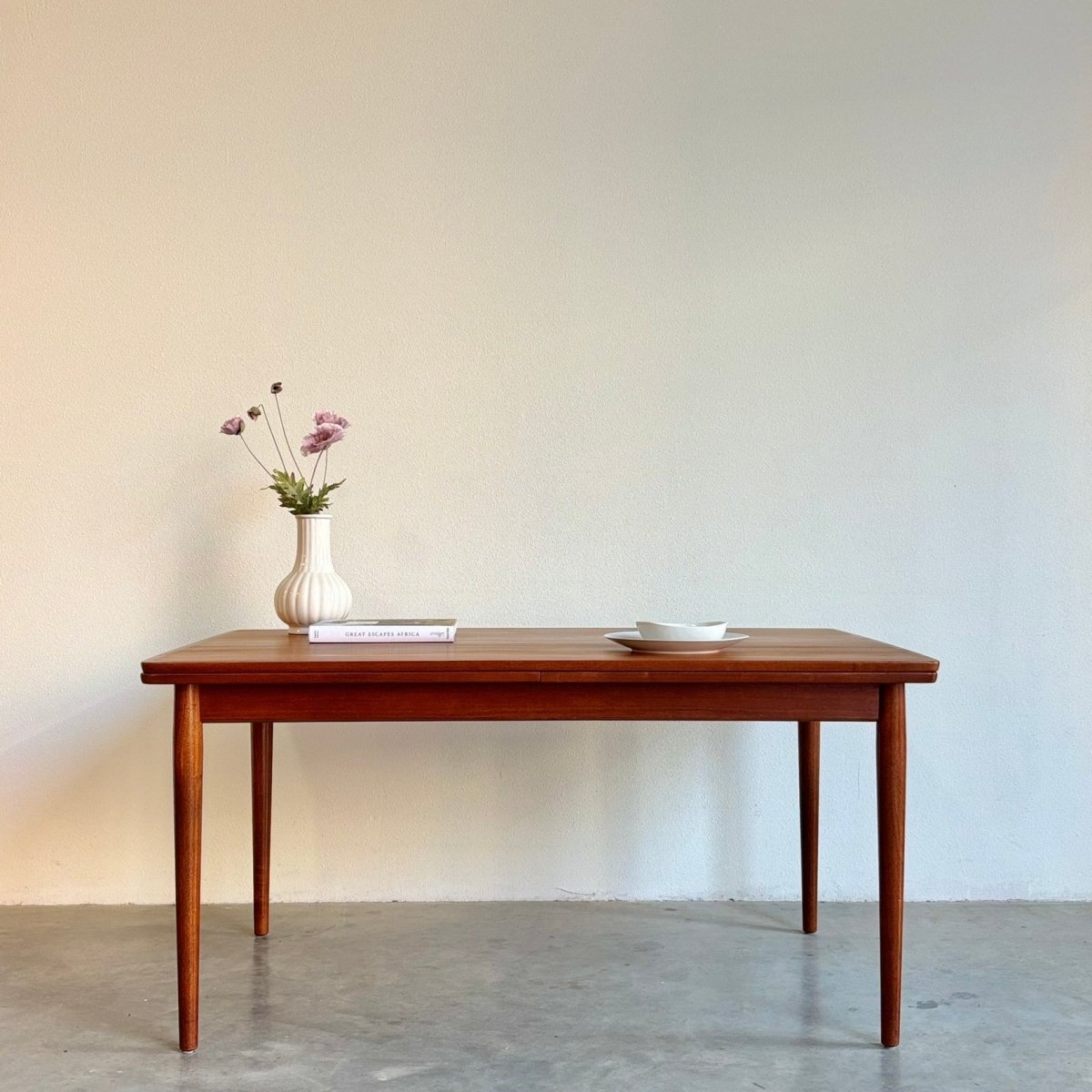 Mid Century uitschuifbare eettafel uit de jaren ‘60. Een Deens design van Helge Sibast en uitgevoerd in teak.