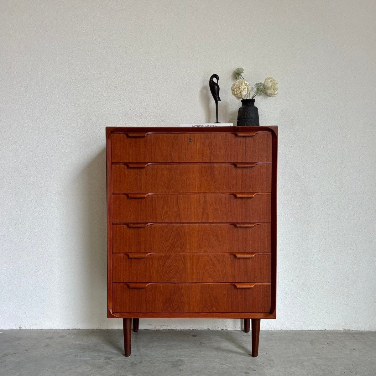 Mid century ladekast uit de jaren ‘60. Afkomstig uit Denemarken en vervaardigd in teak. Mooi detail in de hoeken is de afgeronde afwerking.Afmetingen: 84.5x42.5x118cmLade binnenkant 78x37x13cm
